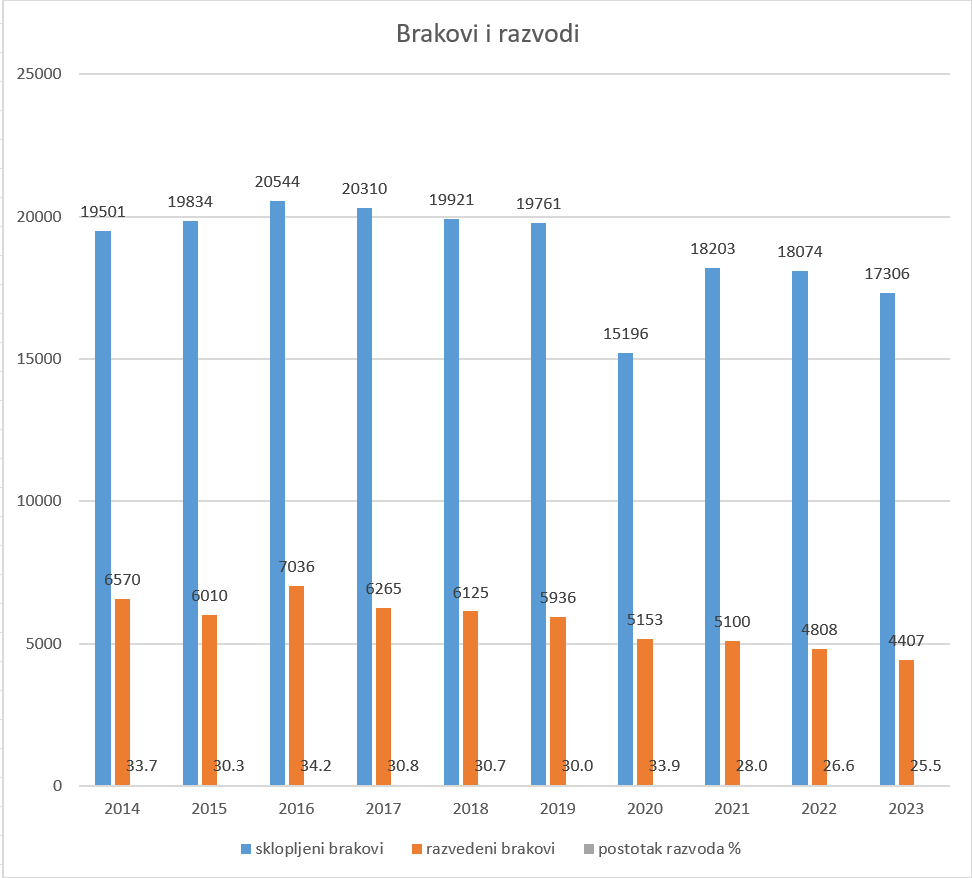 Prema podacima Državnog zavoda za statistiku s podacima do 2023. iz izvještaja Prirodno kretanje stanovništva, pokazuju na trend pada broja razvoda u zadnjih 13 godina. Iako je u 2023. sklopljeno i nešto manje brakova (cca 4.4% manje u odnosu na 2022.) broj parova koji su se odlučili na razvod pao je za čak 9%. Vrhunac broja razvoda smo bilježili 2014. kada je zabilježeno više od 34% razvoda, dok on danas iznosi 25.5.